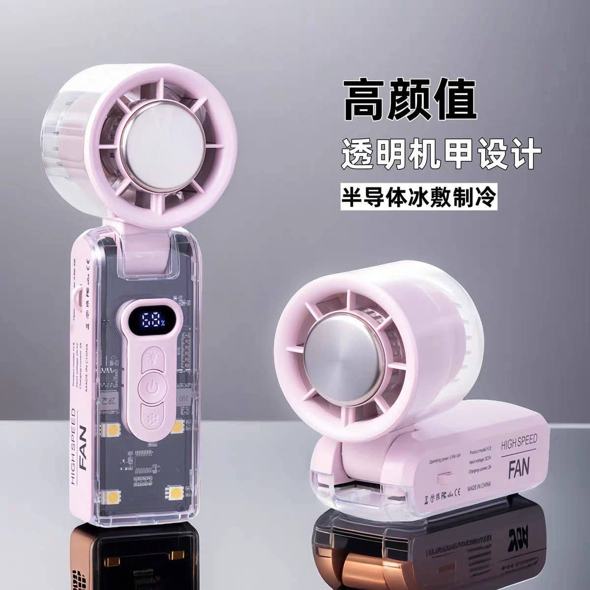 handheld cooling turbo fan featuring a transparent mechanical design and a semiconductor ice-cooling plate for rapid temperature reduction.